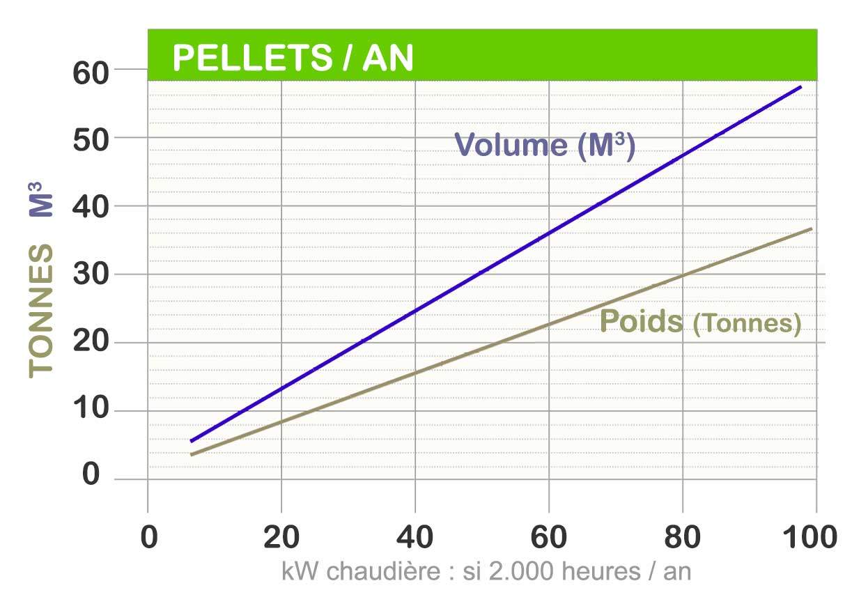 Une chaudière fonctionne l'équivalent de 1500 à 2000 heures / an : à pleine puissance. Pour les nouveaux bâtiments ou les installations existantes, on peut déterminer le volume de pellets consommé /an. Idéalement, la réserve de pellets devrait être remplie une à deux fois par an.