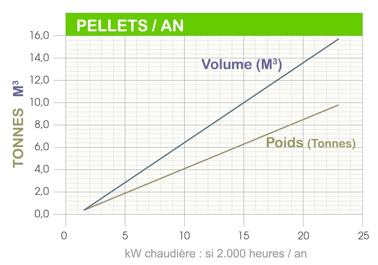 Une chaudière fonctionne l'équivalent de 1500 à 2000 heures / an : à pleine puissance. Pour les nouveaux bâtiments ou les installations existantes, on peut déterminer le volume de pellets consommé /an. Idéalement, la réserve de pellets devrait être remplie une à deux fois par an.