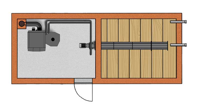 Avec une vis centrale et 2 plans inclinés, une réserve "flex" est construite au départ d'une pièce existante ou avec des cloisons. Cette solution est conseillée quand on veut adapter la réserve de pellets au volume disponible.