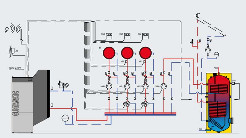 Gestion de l'installation : 1 circuit direct, 2 mélangés, ECS, pompe bouclage et v3v retour. Extensible à 9 circuits. Chaudière modulante : pas besoin de tampon.