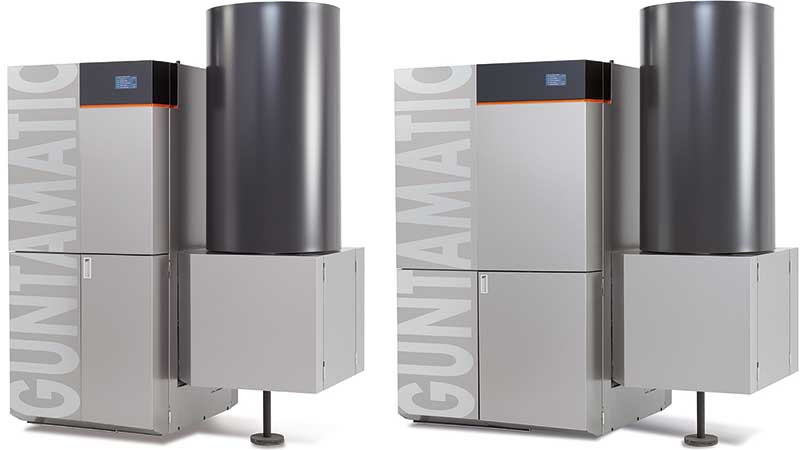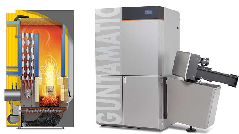 Chaudière à combustibles végétaux par aspiration : grains énergétiques, céréales,... Avec brûleur à gradin autonettoyant, sonde lambda, régulation, haut rendement, faibles émissions, ...