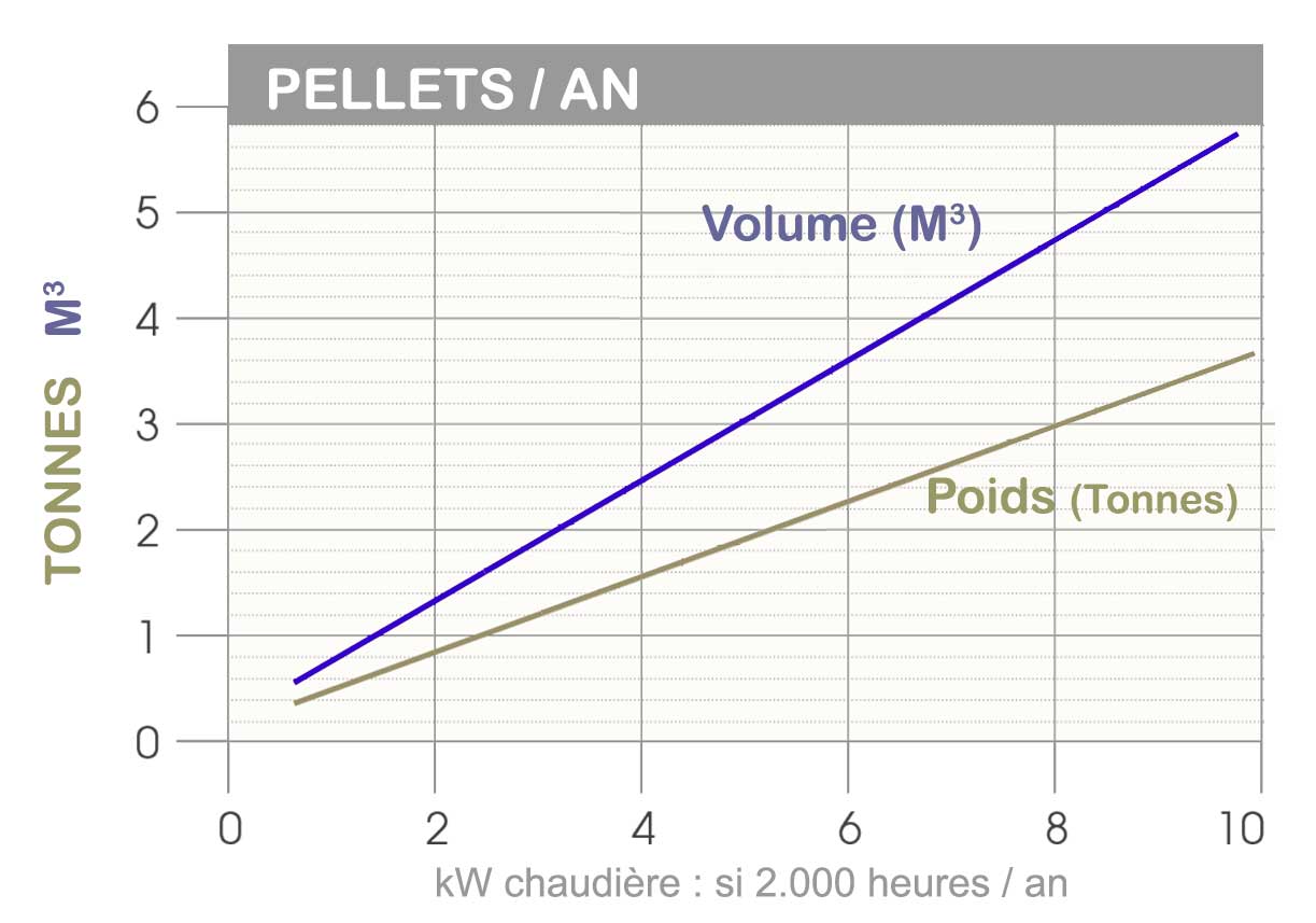 Une chaudière fonctionne l'équivalent de 1500 à 2000 heures / an : à pleine puissance. Pour les nouveaux bâtiments ou les installations existantes, on peut déterminer le volume de pellets consommé /an. Idéalement, la réserve de pellets devrait être remplie une fois par an.