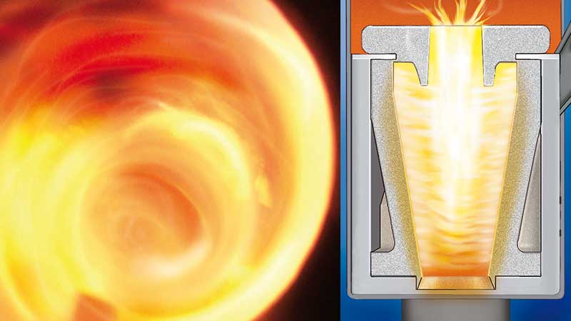 Chambre de combustion en carbure de silicium. Ce réfractaire résistant est adapté aux hautes & basses t° : ceci participe au maintien d'une combustion parfaite à toutes les puissances. L'effet cyclonique diminue le rejet de particules.