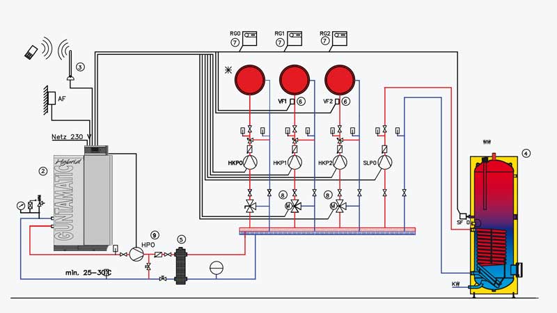 Gestion de l'installation : 1 circuit direct, 2 mélangés, ECS, pompe bouclage et v3v retour. Extensible à 9 circuits. Gère aussi un tampon si il faut accumuler de l'énergie pour produire vite l'ECS.