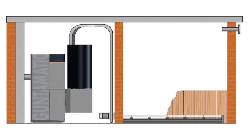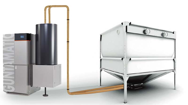 Les grains ou granulés doivent être acheminés de la réserve jusqu'au silo journalier de la chaudière. Pour atteindre la meilleure fiabilité, GUNTAMATIC a opté pour un système pneumatique combiné à une vis. Ainsi GUNTAMATIC gère la vitesse de la vis dans la réserve et peut donc maîtriser le débit de transfert des grains dans le système d'aspiration.