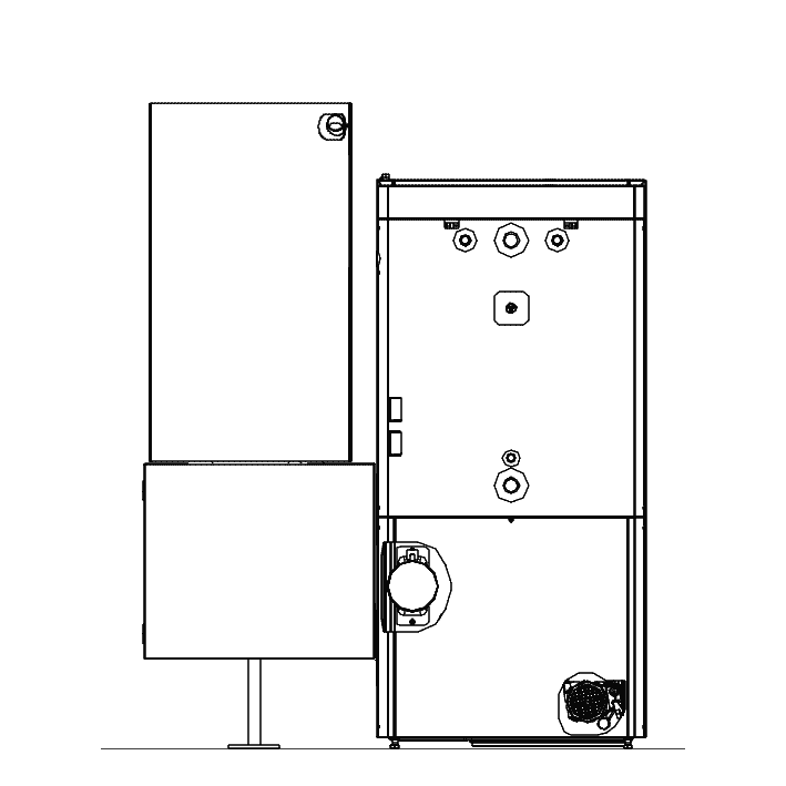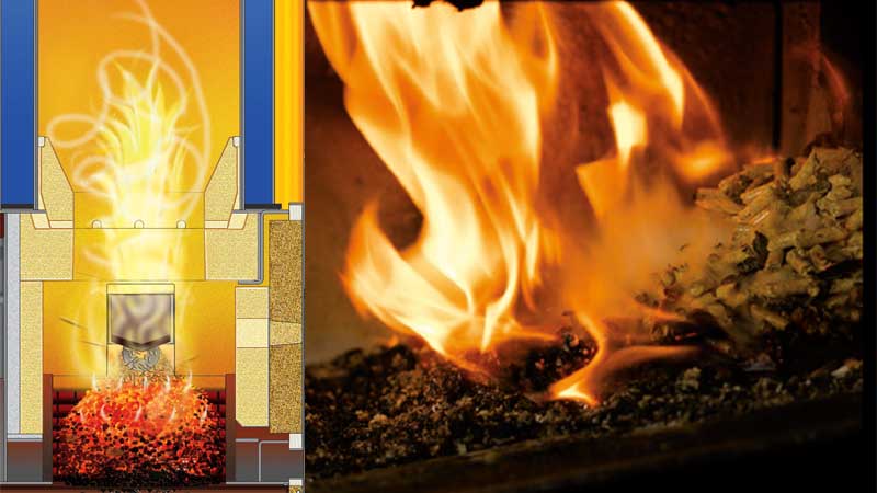Dans la chambre de combustion : en carbure de silicium, le combustible progresse sur une grille à gradins autonettoyante : technologie industrielle éprouvée. Combustion parfaite pilotée par sonde Lambda, les gaz remontent dans un généreux cylindre où les poussières et substances agressives sont neutralisées. Des renforts spéciaux sont placés pour résister aux gaz des combustibles végétaux.