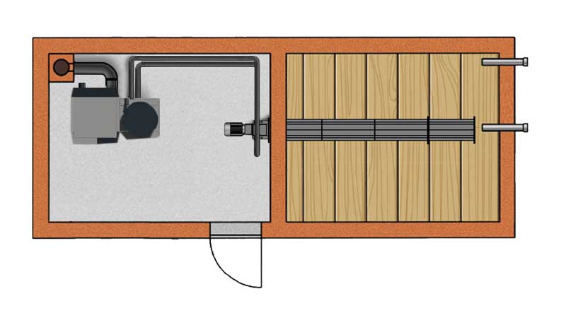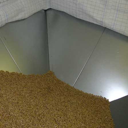 Avec une vis centrale et 2 plans inclinés, une réserve "flex" est construite au départ d'une pièce existante ou avec des cloisons. Cette solution est conseillée quand on veut adapter la réserve de pellets au volume disponible.