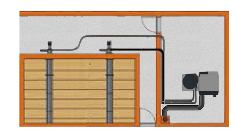 Transport pneumatique des pellets avec réglage du débit. 25m entre chaudière et réserve : sans dégât ni bourrage du combustible.