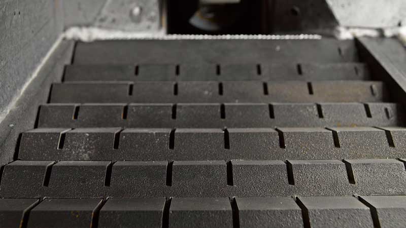 Chambre de combustion réfractaire : en carbure de silicium. Une résistante grille à gradins autonettoyante en fonte assure un va et vient d'une marche sur deux pour acheminer le combustible jusqu'à l'évacuation des cendres.