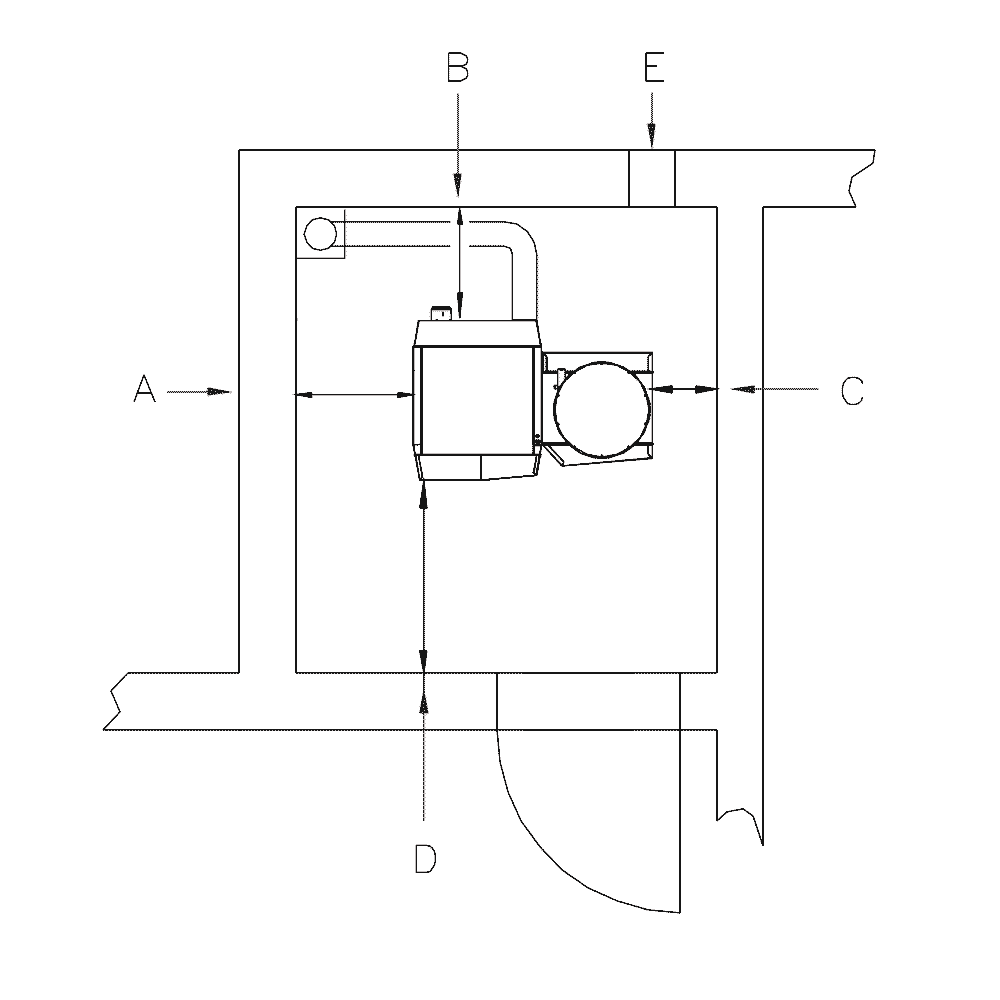 E : ventilation : min 100 cm² jusqu'à 50 kW.