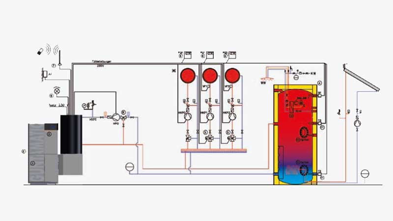 Gestion de l'installation : 1 circuit direct, 2 mélangés, ECS, tampon, pompe bouclage et v3v retour. Extensible à 9 circuits. Gère aussi une cascade de 4 chaudières.