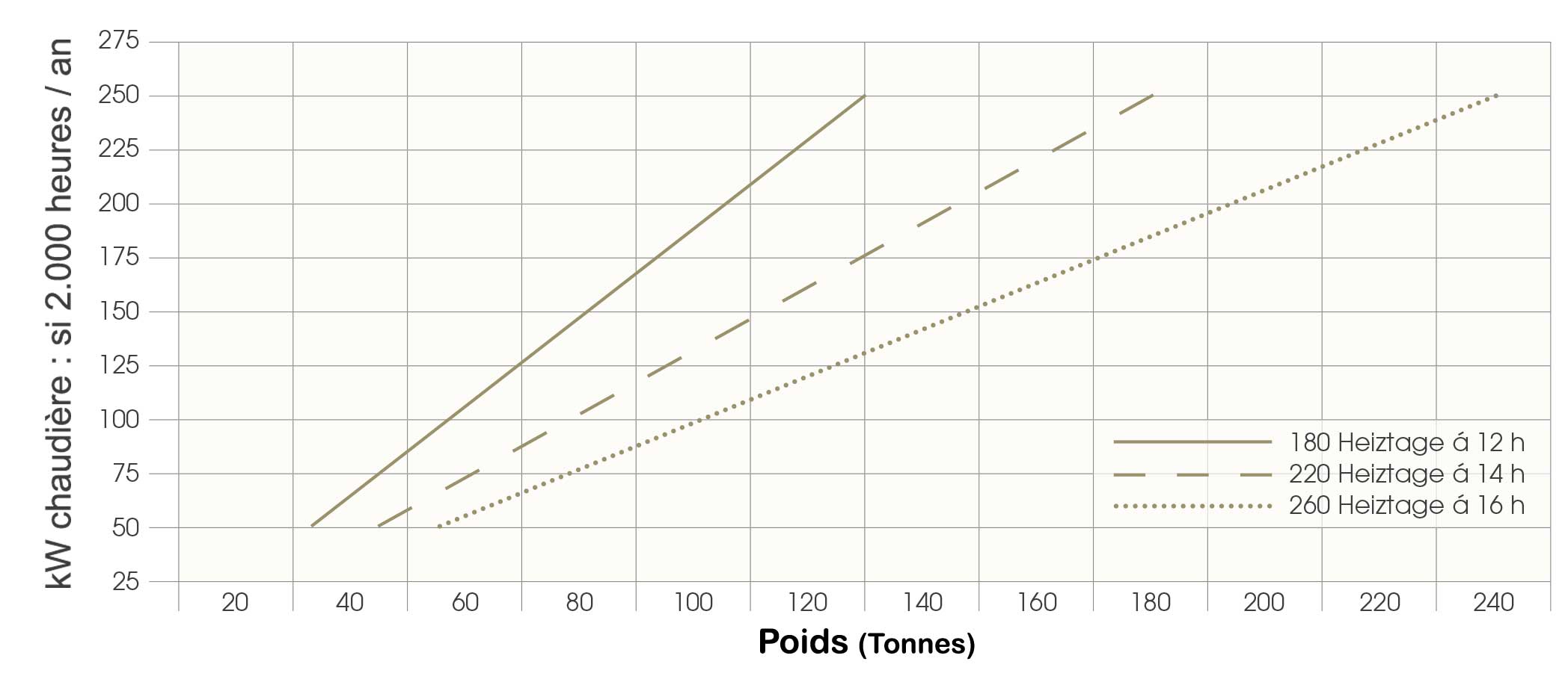 Une chaudière fonctionne l'équivalent de 1500 à 2000 heures / an : à pleine puissance. Pour les nouveaux bâtiments ou les installations existantes, on peut déterminer le volume de pellets consommé /an. A ce niveau de consommation, idéalement, la réserve de pellets devrait être remplie deux à plusieurs fois par an. Toutefois, pour les grandes consommations annuelles, il est préférable de dimensionnner une réserve pour être livré par camion complet.