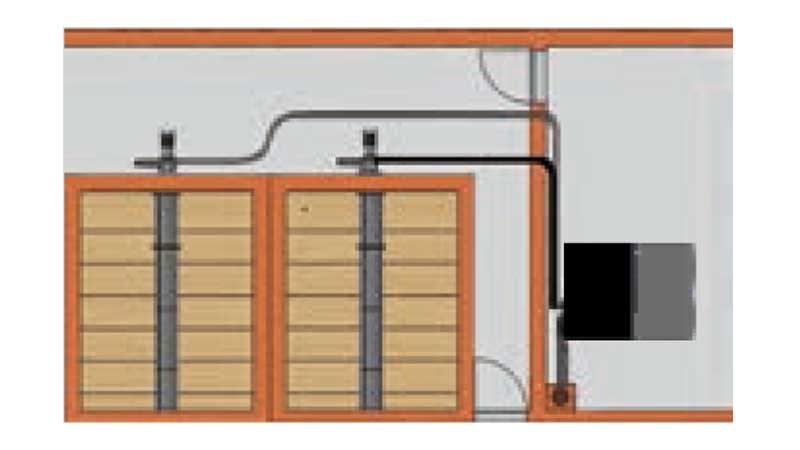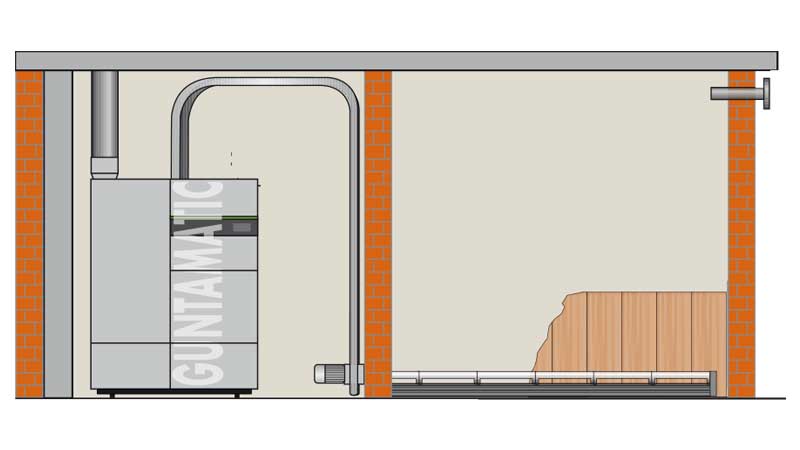 Les pellets doivent être acheminés de la réserve jusqu'au silo journalier de la chaudière. Pour atteindre la meilleure fiabilité, GUNTAMATIC a opté pour un un système pneumatique combiné à une vis. Ainsi GUNTAMATIC gère la vitesse de la vis dans la réserve et peut donc maîtriser le débit de transfert des pellets dans le système d'aspiration. Dans une plage horaire déterminée, la chaudière aspire des pellets une fois par jour. Grâce à la gestion du débit, la distance entre la chaudière et sa réserve peut aller jusqu'à 25 mètres : sans dégât ni bourrage.